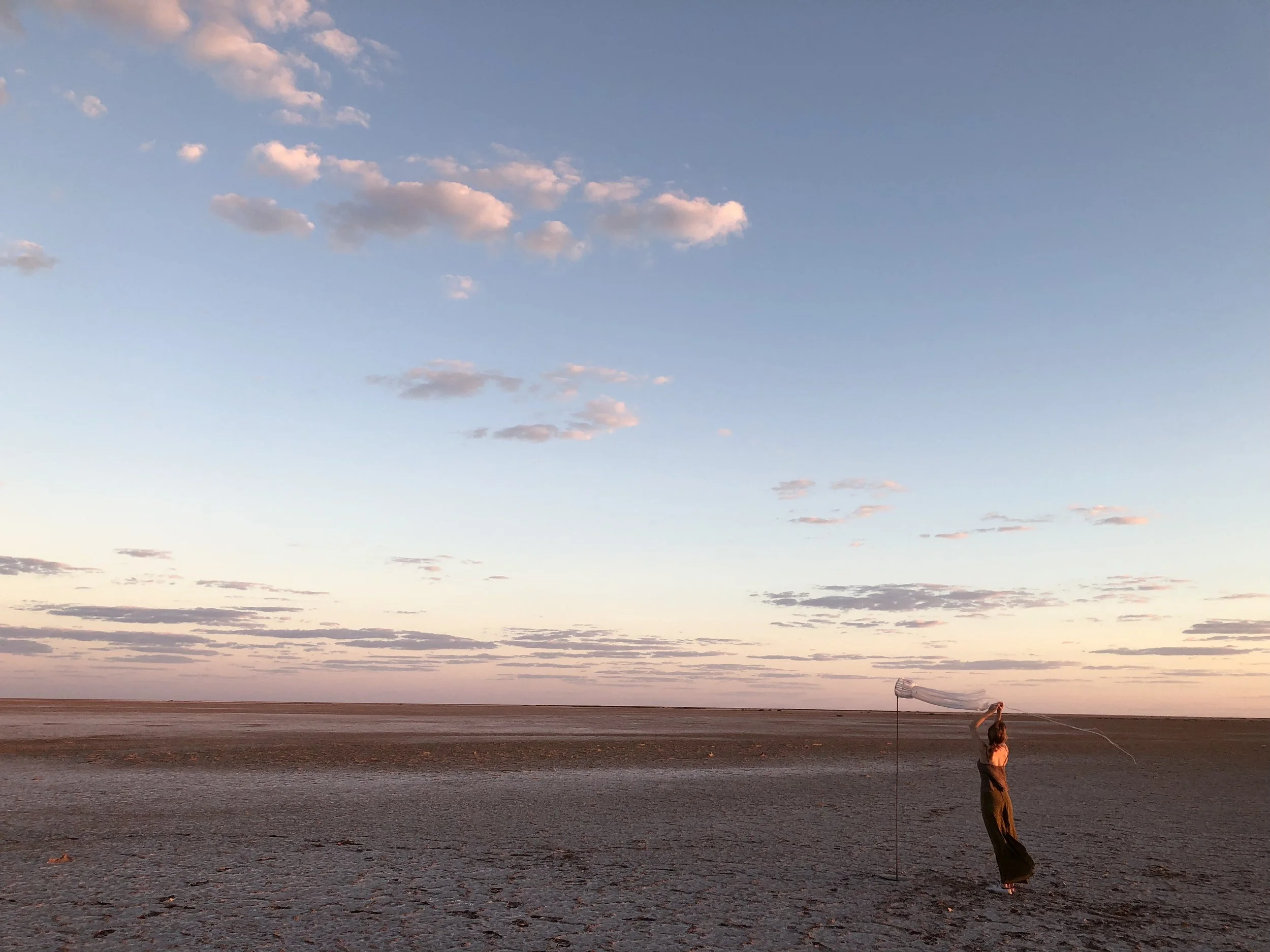 I am deeply interested in the space of affect and becoming that unfolds between human and non-human entities, materials and atmospheres, as it is here that the we can attune to the nuances of our relationship with the more than human world, and come to a more expanded and embodied understanding of the complex and beautiful network of life that we are inhered within. My work begins in the energy of this experience. I create sensory wellsprings for my studio practice by exploring this space of becoming through immersive experience in natural environments. My current work investigates the nature of liminal environments, such as the temporal threshold of dusk and the spatial threshold of the Australian desert. Through deepening into my relationship with these landscapes, I explore the ways they may inspire one towards their liminal, transforming qualities, prompting a loosening of the frameworks of ‘ordinary’ perception. Through attuning to the lesser trodden territories of sensory experience, perception begins to expand and evolve. In my recent PhD research I engaged with the environment through materials and artworks, which were activated by land and atmosphere, interpreting them in their own unique ways. These performative engagements in landscape were a way of exploring and reframing perception within it by reaching into it differently through material. They precipitated in visual, felt, and affective ways, the networking between self and environment, the breath-like, perceptive and energetic flow across the boundaries of self and other.